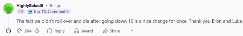 -(204贊)我們在落后16分時沒有直接崩盤,這一次的表現(xiàn)真是一個可喜的變化。謝謝詹姆斯和盧卡