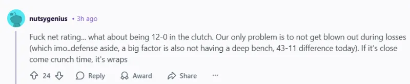 -(24贊)去TMD凈效率……12勝0負(fù)的關(guān)鍵時刻記錄怎么樣?我們唯一的問題是輸球時不要被打爆(在我看來……防守固然是因素,但大問題還是板凳不夠深厚,今天差了43-11)。比賽到關(guān)鍵時刻還接近的話,那就穩(wěn)了